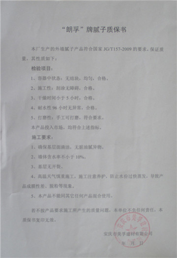“朗孚”牌膩子質(zhì)保書